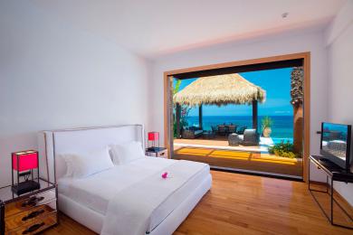 The villa, located on the beachfront and offering a private area on the beach with personal sun beds & umbrellas, is a 3-Bedroom luxury villa (living space 1.070 m²) with a private heated swimming pool.