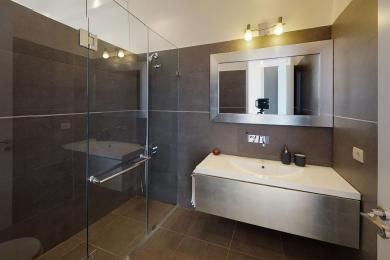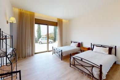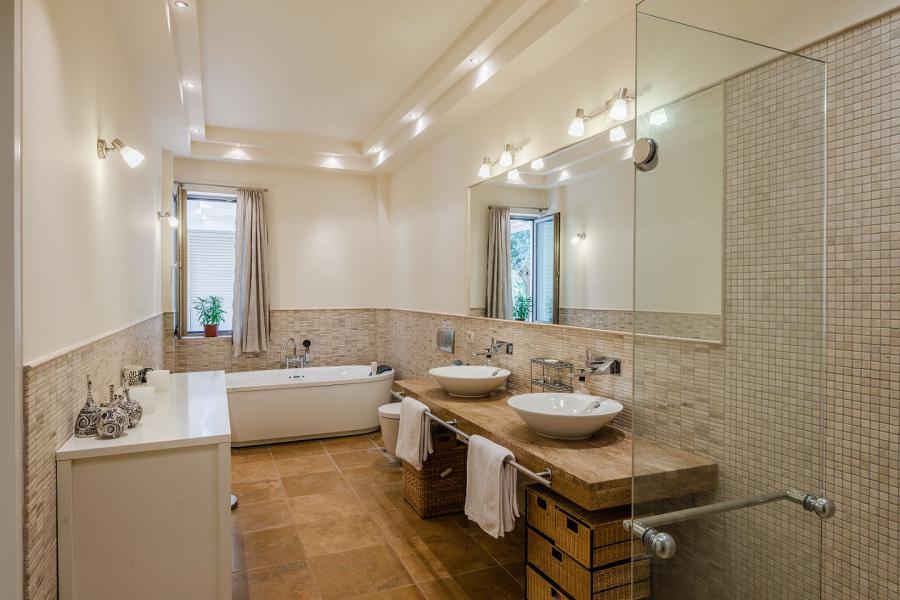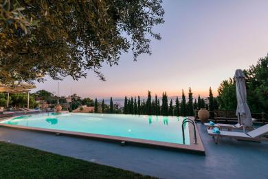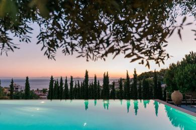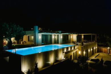 Outside at the level of the first floor, there are spacious verandas with al fresco dining, a big infinity swimming pool (15x6), a barbecue area, and a beautiful lawn garden with century-old olive trees, seating of which enjoys a panoramic sea view and wonderful sunsets.