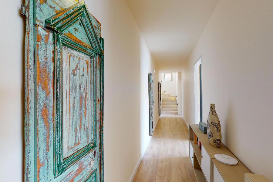 On the ground floor, there is a parking area for four cars and a lawn garden with lemon trees.