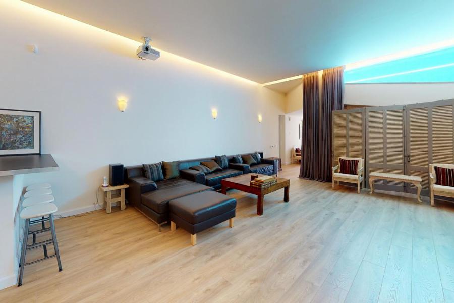 On the ground floor, there are three bedrooms with en suite baths, a large playroom with a fireplace, home cinema, and an elevator leading to the first floor where there is a spacious dining-living room with a modern fireplace, kitchen, office, W.C., and the main master bedroom with en suite bath, jacuzzi, and walk-in wardrobe.