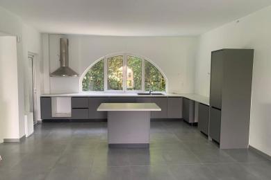 On the ground floor, you'll find a garage, storage spaces, and a WC. The raised ground floor boasts an elegant living room with a double-height ceiling and fireplace, balconies with garden views, a dining room, and another WC.
