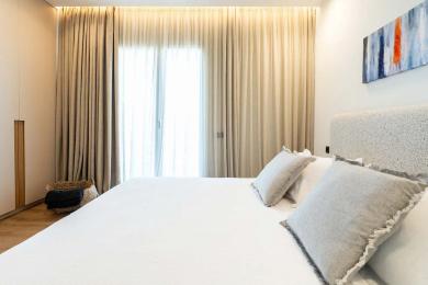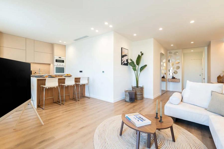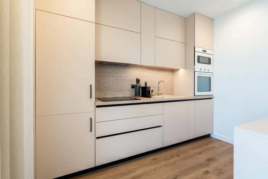 The apartment features two spacious bedrooms, both opening onto private balconies, along with two bathrooms and an additional WC. The modern gourmet kitchen overlooks the open-plan dining and living area and leads directly to a large balcony with impressive sea views, ideal for relaxing or entertaining.