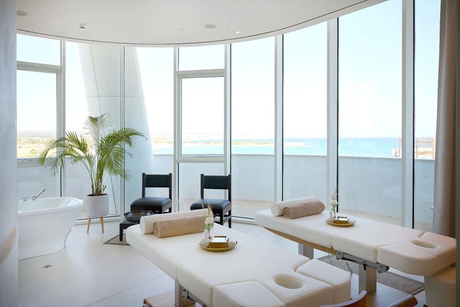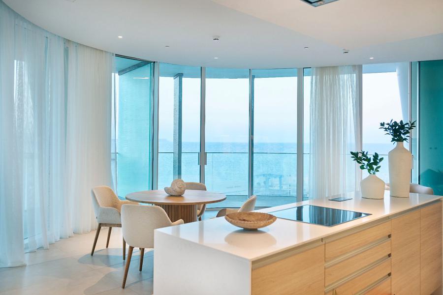 Wellness facilities include a fully equipped fitness center and a 400 m² luxury spa dedicated to relaxation and rejuvenation. Residents and guests are welcomed through an elegant double-height lobby with a sculptural ceiling and panoramic glass façade, creating a striking first impression and a true sense of arrival.