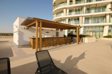 Residents enjoy a refined collection of private amenities designed for relaxation and wellbeing. A spacious Level 3 amenity deck features an infinity-edge swimming pool with marina and sea views, complemented by private cabanas, shaded lounge areas, and an outdoor pool bar.