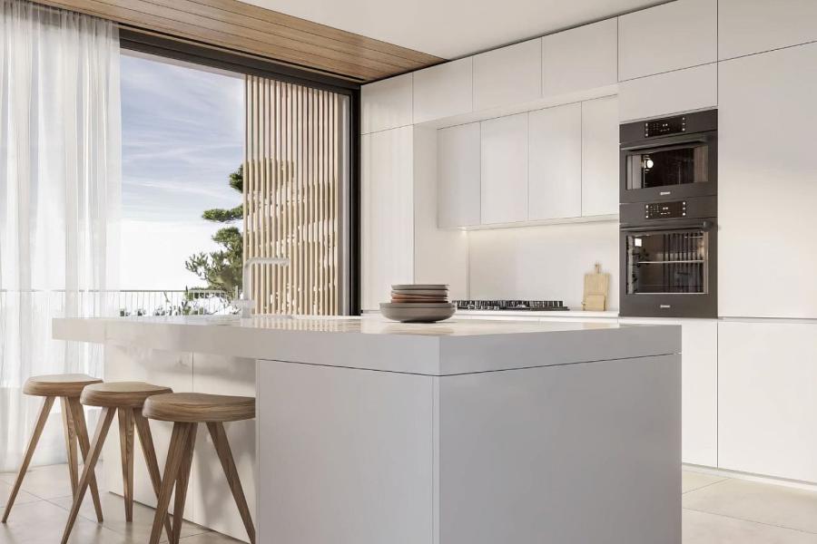 Inside, the basement spans 89.5 sq.m., housing two master bedrooms—one smaller, suitable for service use—and a living area with approximately 3-meter-high ceilings. Natural light floods the space thanks to cours anglaise windows in every room. The ground floor offers 101 sq.m. of living space, featuring another master bedroom, a living room with a striking double-height ceiling, and an open-plan kitchen that seamlessly blends style and functionality.