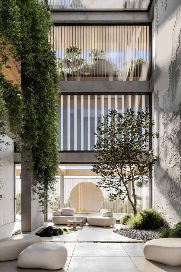 The basement, covering 98.5 sq.m., contains two master bedrooms—including a large bedroom with cours anglaise windows to maximize natural light—and a comfortable living area with a ceiling height of approximately three meters. On the ground floor, the 90 sq.m. space features one master bedroom, a living room with an impressive double-height ceiling, and an open-plan kitchen designed for both functionality and style.