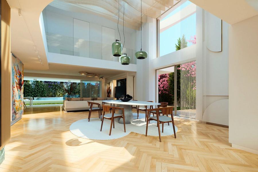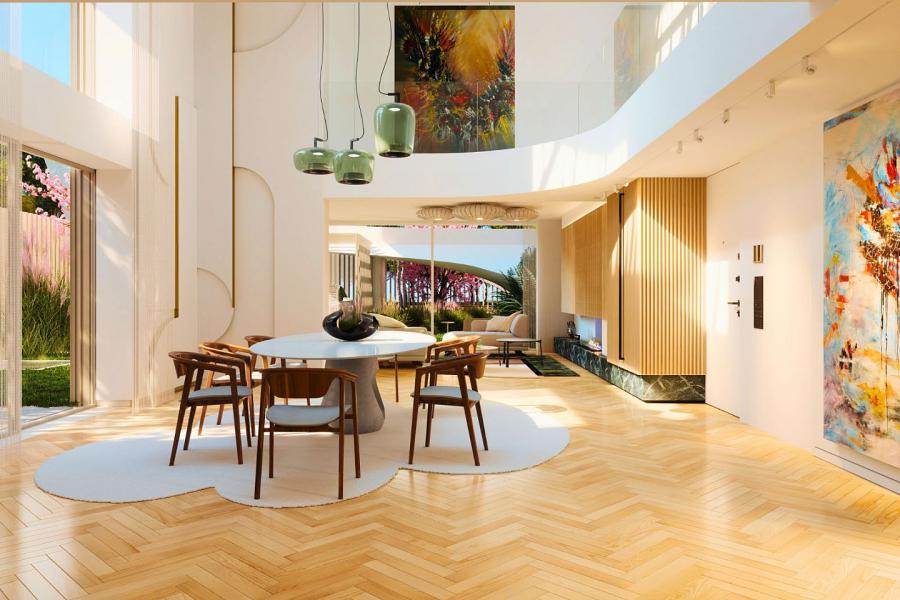 The home features four luxurious en-suite bedrooms and an additional maid’s room, all appointed with high-end materials and meticulous attention to detail. A striking double-height dining area rises all the way to the roof, drawing in abundant natural light from above and giving the interior a dramatic, airy feel. With smart home technology, underfloor heating, and an A+ energy efficiency rating, this residence combines contemporary comfort, refined design, and a prime coastal location to deliver a truly sophisticated lifestyle.