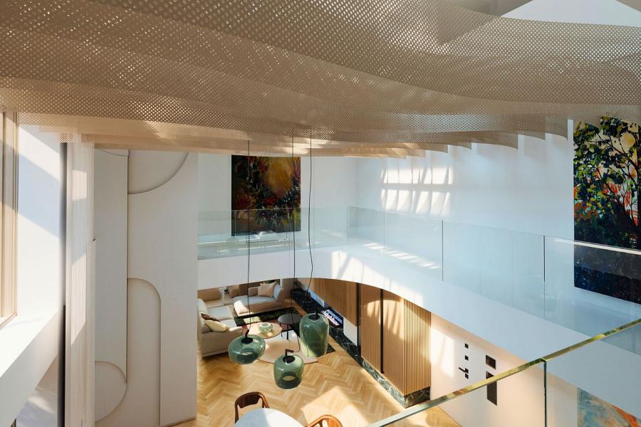 • Dramatic double-height dining area with roof-level ceiling and top light