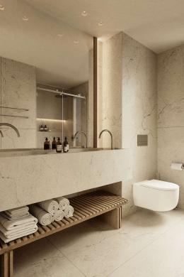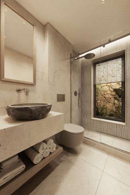 The first floor hosts three beautifully appointed bedrooms, each with its own en-suite bathroom and wardrobe. Designed with natural textures and calm, nature-inspired tones, these rooms serve as intimate retreats that embrace the peaceful hillside atmosphere. The top floor is dedicated to the master suite, complete with an en-suite bathroom, walk-in wardrobe, and a private terrace offering panoramic sea views.