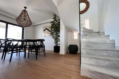 This exquisite 148 sq.m. maisonette spans the 2nd and 3rd floors of a prestigious building in Panorama, Voula, offering a rare combination of luxury, comfort, and breathtaking sea views. Fully renovated in 2023, the residence is sold fully furnished with high-end finishes and thoughtfully designed interiors. The open-plan living and dining areas, complete with a marble fireplace, flow seamlessly onto an expansive balcony overlooking the serene Athenian Riviera.