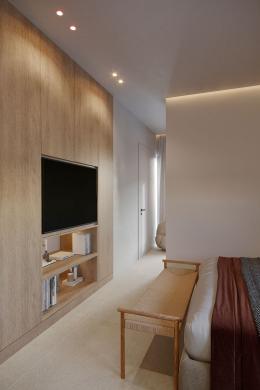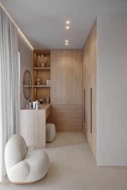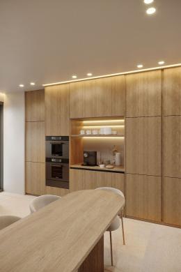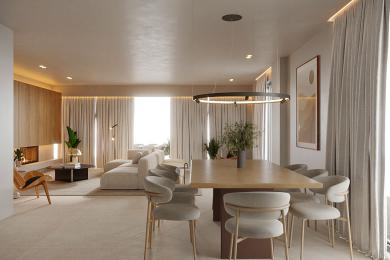 The apartment features three spacious bedrooms, including a master bedroom with a dedicated dressing area, and three contemporary bathrooms. Designed for both comfort and entertaining, the residence includes a private bar area, adding a unique and sophisticated touch to the living space.