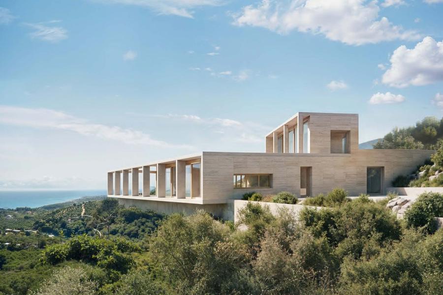 Thanks to the villa’s dramatic elevation, the main living spaces appear suspended above the terrain, maximizing the spectacular sea views and enhancing the architectural impact.