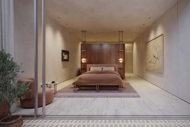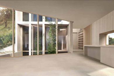 The entrance welcomes you through locally sourced natural stone walls into a charming inner courtyard, leading to a bright and spacious open-plan living room. This area flows seamlessly into a bespoke kitchen and dining space. Large retractable glass walls open fully to the outdoor terrace, gardens, and swimming pool, effortlessly merging indoor luxury with the stunning natural surroundings.