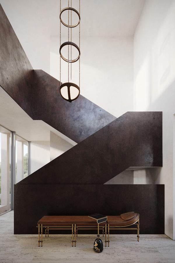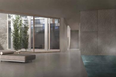 • Lower Level: An additional ensuite bedroom, lounge area, spa, sauna, jacuzzi, and utility room arranged around a sunlit courtyard, creating a peaceful and cohesive private sanctuary.