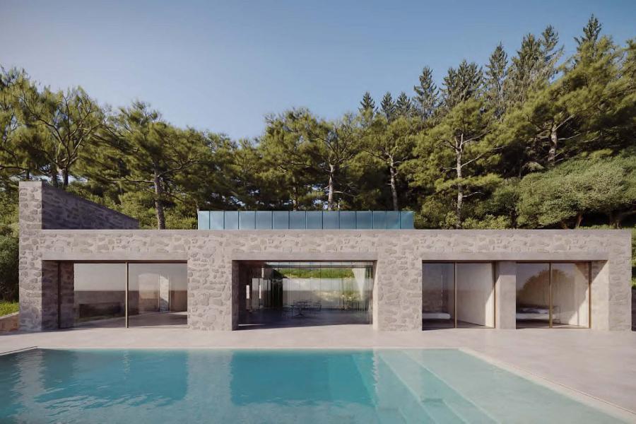 Set on a sprawling 6,000 sqm plot, the estate consists of a stunning 240 sqm main villa positioned elegantly atop the hill, maximizing the spectacular sea views and surrounding natural beauty. The villa’s most striking architectural feature is its impressive glass roof structure, which floods the interior spaces with natural daylight and creates a bright, open, and inviting atmosphere throughout the home.