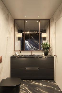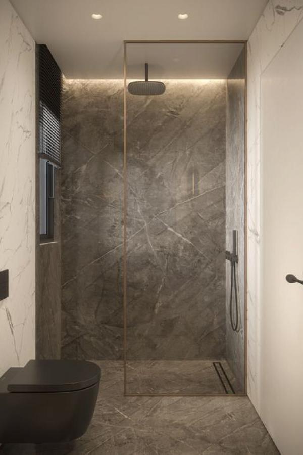 The ground floor also hosts a refined master bedroom with a luxurious en-suite bathroom, providing both comfort and convenience. An internal staircase leads to the first level, where two additional master bedrooms await, each with its own en-suite bathroom, offering privacy and elegance for family members or guests.