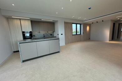 The apartment features three spacious bedrooms, providing ample room for both relaxation and functional living. Large openings fill the interiors with natural light, enhancing the serene atmosphere and making the most of the sweeping views.