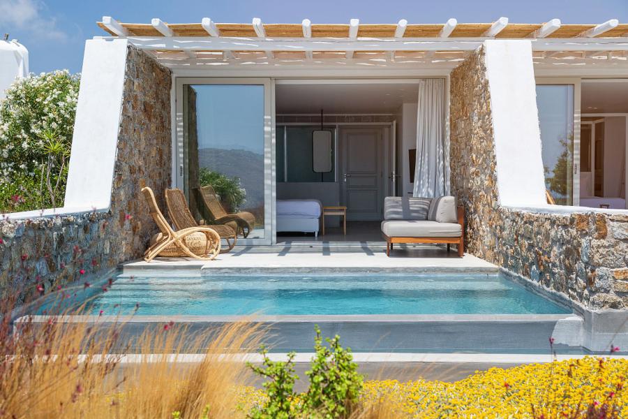 -Pool Suite 1: en suite double bedroom with private mini pool (which may be heated upon request) with sea/beach view