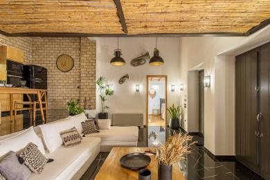 The ground floor consists of an autonomous residence with a garden view, which includes one bedroom with an ensuite bathroom (double bed), a living room, fully equipped kitchen with high-tech electrical appliances, a dining room, a loft for two persons (two single beds that can be joined to form a double), an outdoor dining table, and a sofa with two small coffee tables. There is also an indoor private parking for two cars, a gym room, and an autonomous room for the housekeeper. An elevator that stops on the first and second floors can be accessed through the parking.
