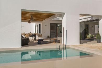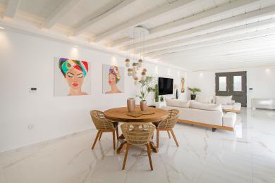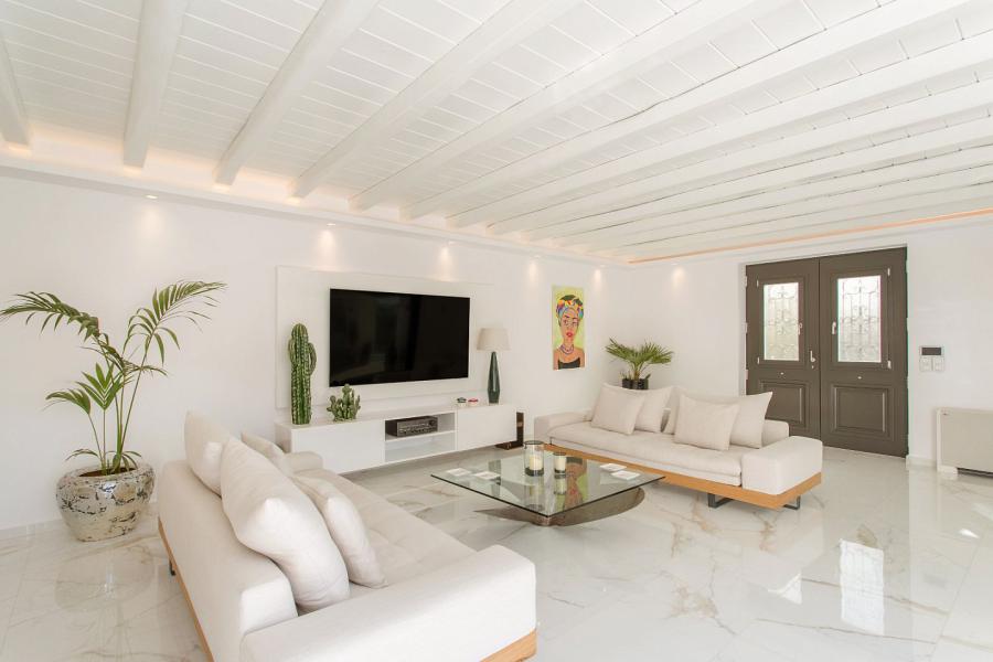 The villa is located in Piso Livadi, Paros and covers an area of 530 square meters. It has an urban style and is surrounded by lush trees and plants.