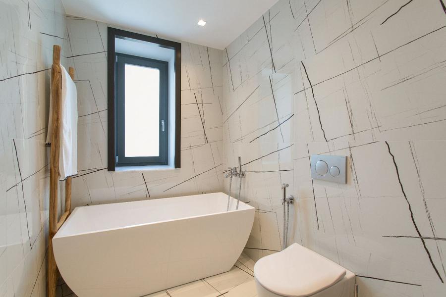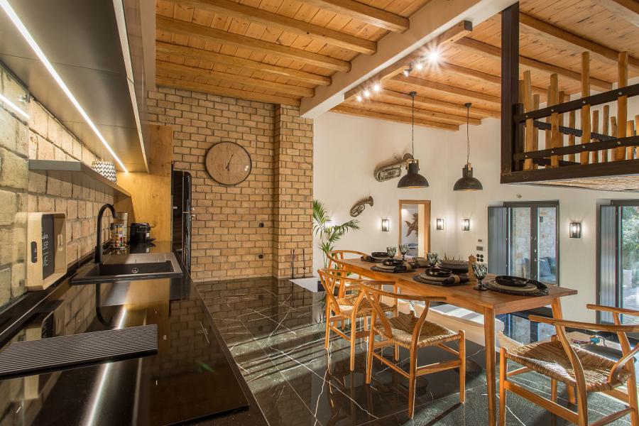 The first floor features a big living room, dining room, fully equipped kitchen with high-tech electrical appliances, and a kitchen island for cooking attached by a table-bench for four persons. There is also a WC, a big terrace with sea view, a private pool, outdoor living room and dining table, pillow chairs, and sun beds. The second floor has three bedrooms with their ensuite bathrooms (one with a bathtub and two with showers), big modern wardrobes for each room, and a common terrace for the three bedrooms with sea view with butterfly chairs, pillows, and a coffee table.