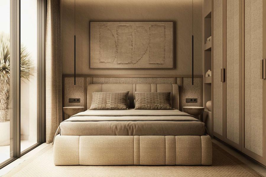 The first floor hosts three beautifully appointed bedrooms, each with its own en-suite bathroom and wardrobe. Designed with natural textures and calm, nature-inspired tones, these rooms serve as intimate retreats that embrace the peaceful hillside atmosphere. The top floor is dedicated to the master suite, complete with an en-suite bathroom, walk-in wardrobe, and a private terrace offering panoramic sea views.