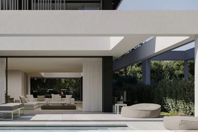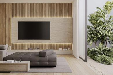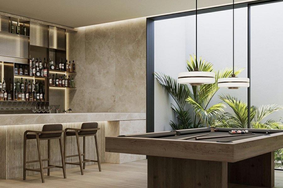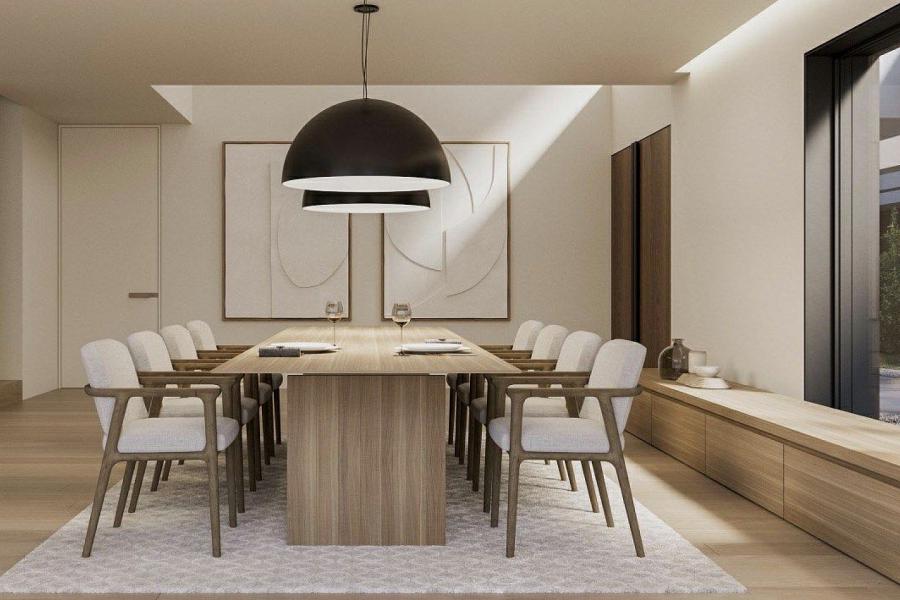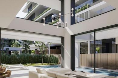 The ground floor showcases expansive open-plan living and dining areas, seamlessly connected to a state-of-the-art gourmet kitchen. Large openings lead to a beautifully landscaped private garden of 194.54 sq.m, complete with a private pool.