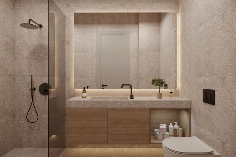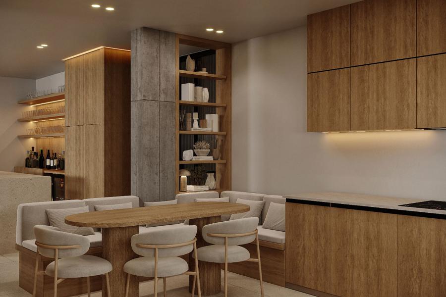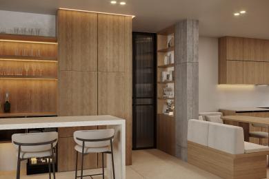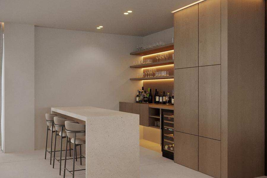 The apartment features three spacious bedrooms, including a master bedroom with a dedicated dressing area, and three contemporary bathrooms. Designed for both comfort and entertaining, the residence includes a private bar area, adding a unique and sophisticated touch to the living space.